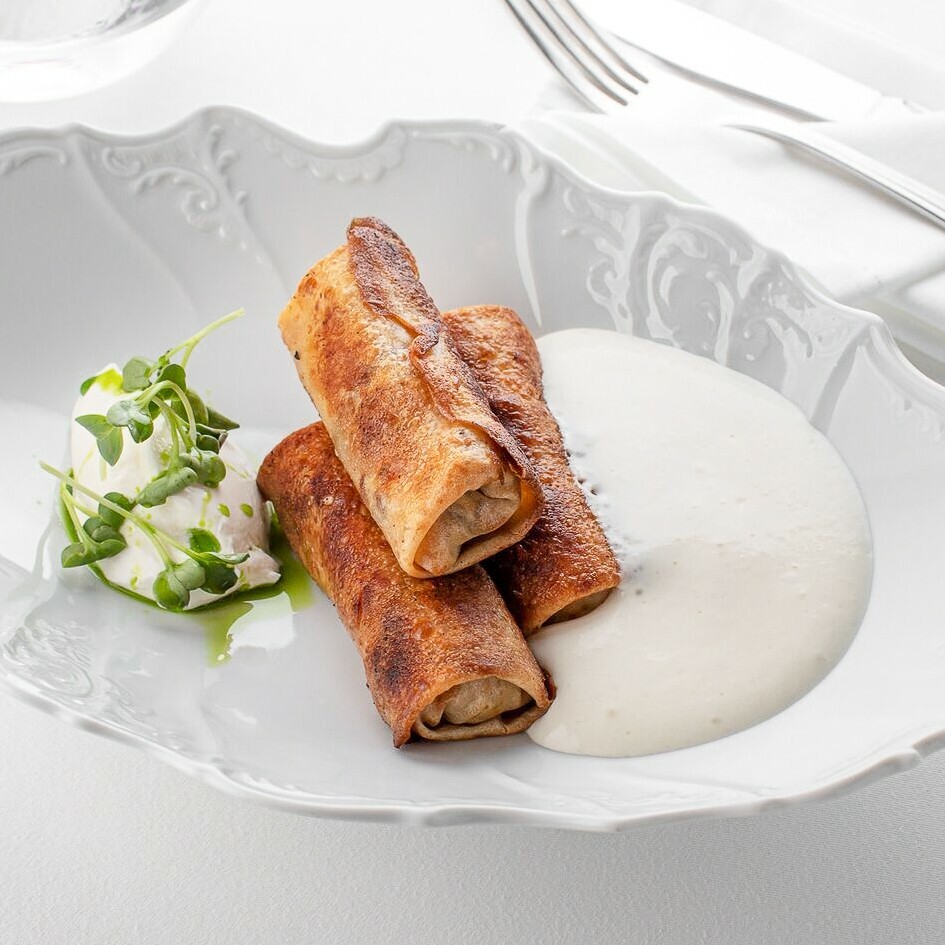 Питательные ажурные блинчики с сытной начинкой из телячьего языка, заправленной терпким муссом из пармезана. С телячьим языком и муссом из пармезана (3 шт.)