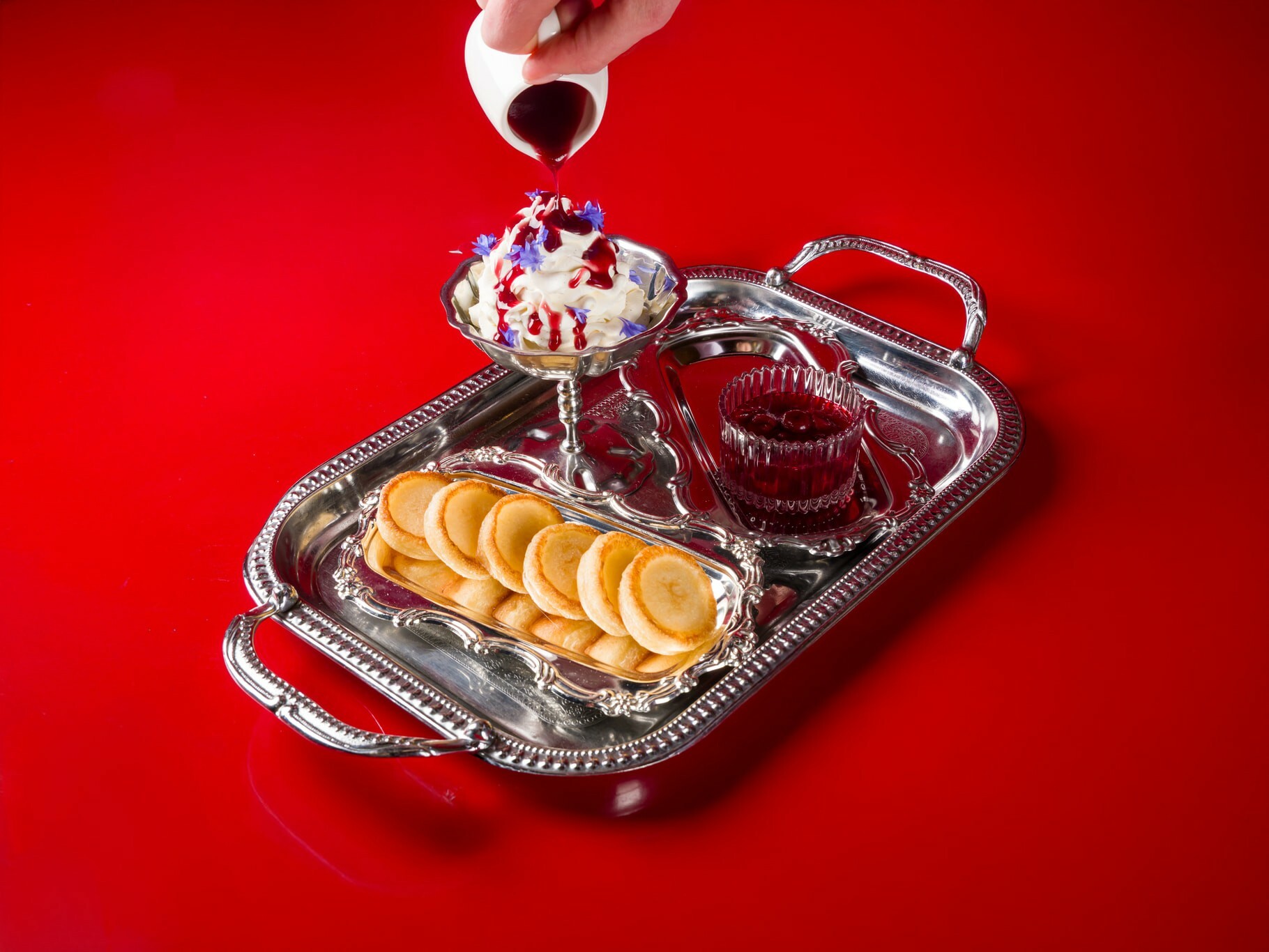Дрожжевые мини оладьи, подаются со взбитым кремом на основе 30% сметаны, сливок и ванили, соусом на основе цельной вишни, а также соусом на основе малинового пюре