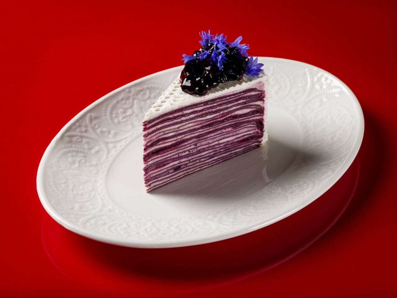Тонкие коржи на основе яиц, молока и муки, прослоенные кремом на основе крема патисьер со сливками и ванилью, а также джемом на основе сока черной смородины и ягод черники; Украшается черничным гелем с ягодами черники и цветками василька