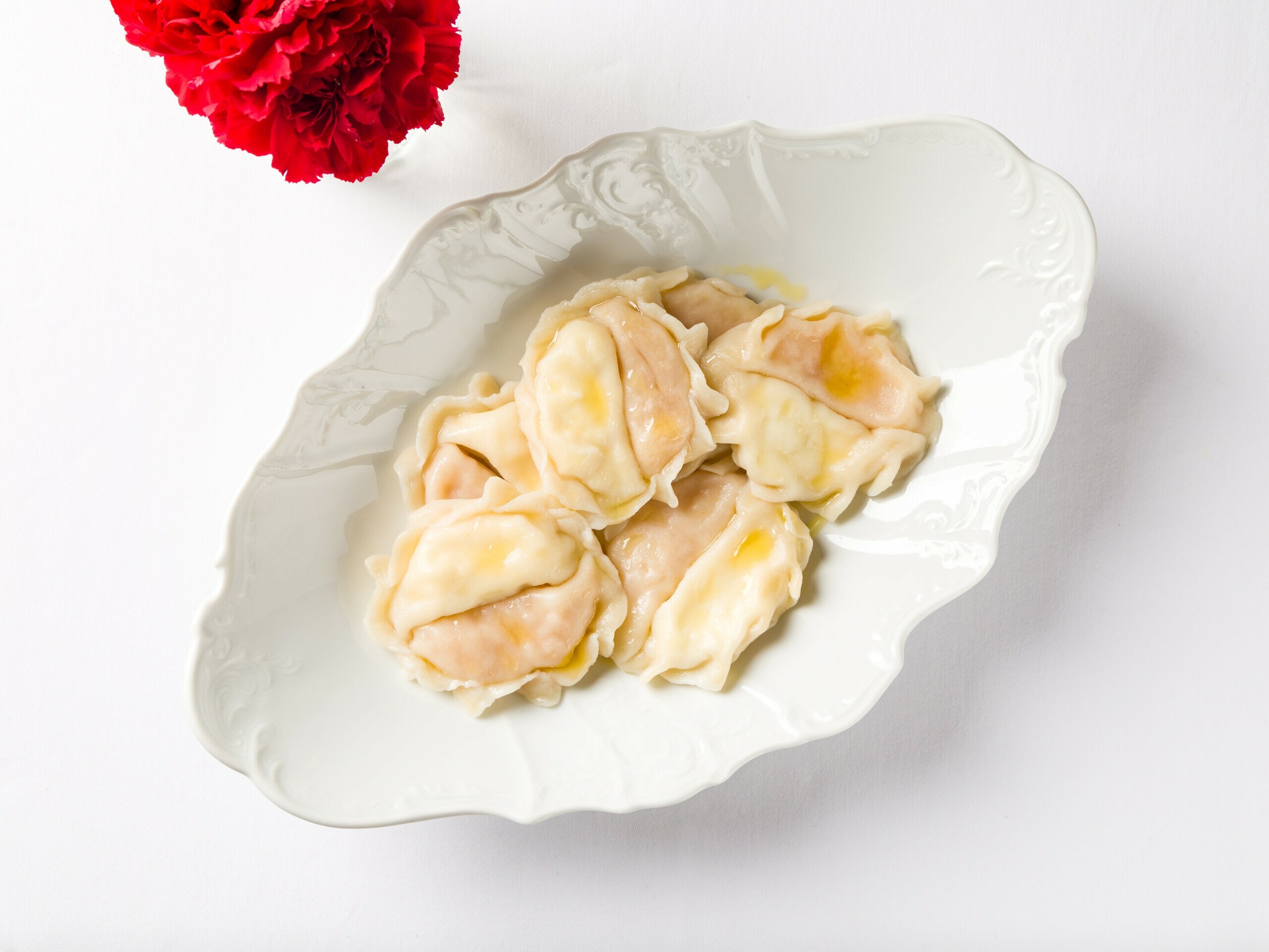 Пельмени на основе фарша из оленины и говядины. С добавлением жаренного лука и устричного соуса.