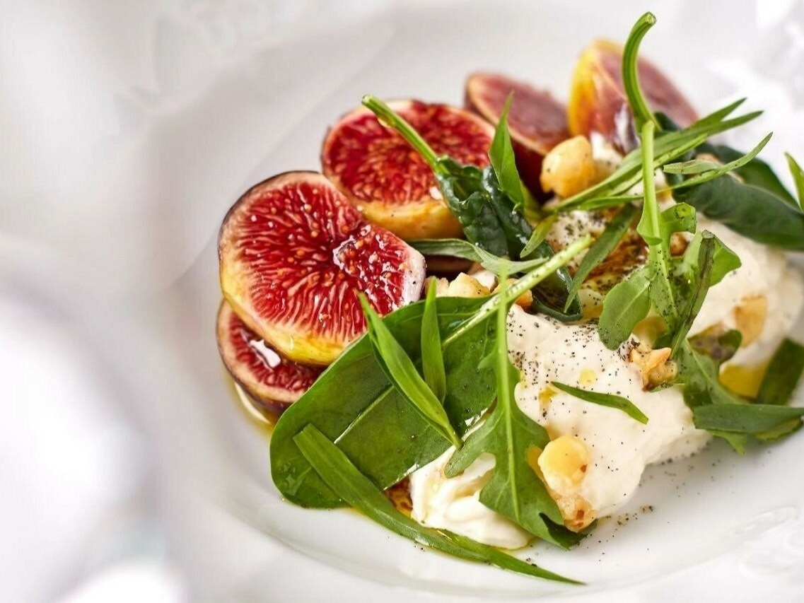 Изысканный салат с нежным вкусом: страчателла гармонично сочетается со свежим инжиром и заправкой на основе лимона. Орехи и чипсы фило добавляют хрустящую текстуру, а эстрагон и соус понзу — утончённый аромат.